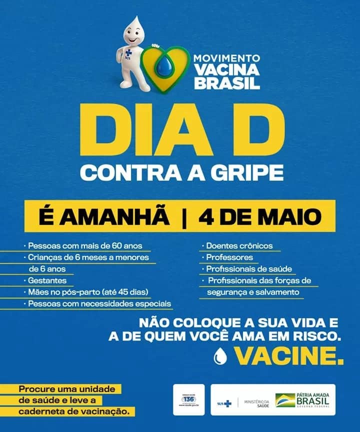 O Dia D, em que a vacinação se intensifica e há uma grande mobilização nacional, está marcada para dia 4 de maio, um sábado.