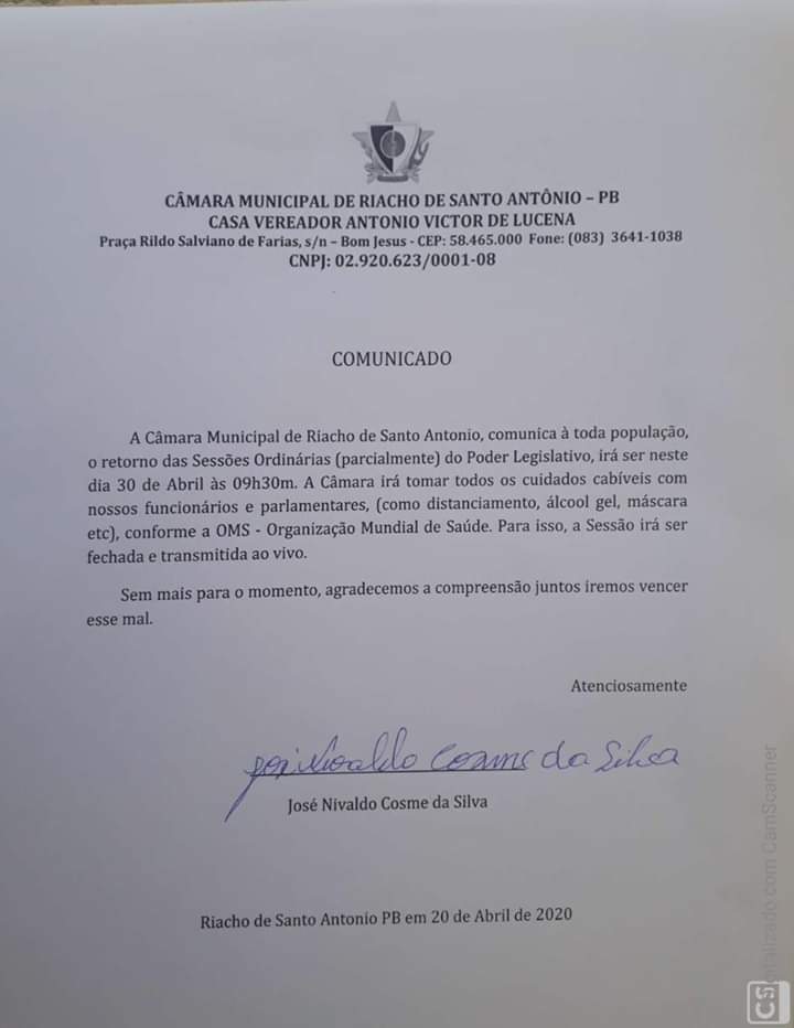 Conforme comunicado, a Câmara Municipal irá realizar a SESSÃO ORDINÁRIA dia 30 de Abril 2020, para aprovação de matérias pendentes, no entanto, a Câmara irá cumprir todos os trâmites legais conforme a OMS Organização mundial de saúde, pela segurança de nossos funcionários e parlamentares.